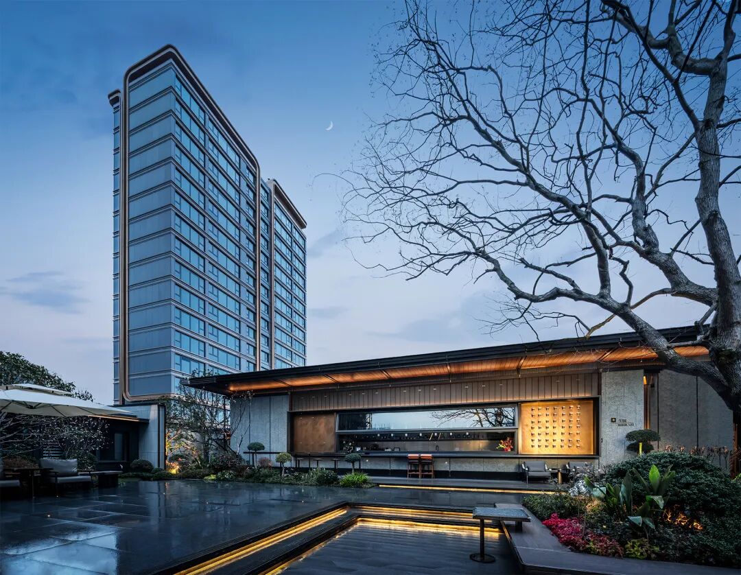 寬大飄逸的金屬屋檐由成本更高的木紋鋁板密拼而成,平整度經得起各種角度下的陽光照射檢驗,金屬網編織對景屏風與厚重奢石景墻形成視覺的中心與兩翼,配合前置水景、地面跳色鋪裝以及石材開槽內部燈光漫反射。