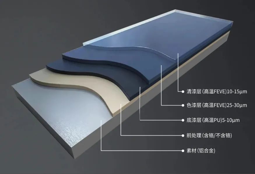 采用加工難度更高,造價更貴的3系鋁板。3.0mm足厚鋁板,遠超市場常規(常規2.5mm厚板,實際規格甚至達不到2.35mm)。鋁板表層選用美國進口PPG氟碳漆,與普通烤漆對比大大提高了抗氧化、抗酸雨、抗紫外線等性能,不僅節能環保,其皓月銀、香檳金的色澤,讓建筑立面更顯奢華質感,即使經過數十載,仍歷久彌新。